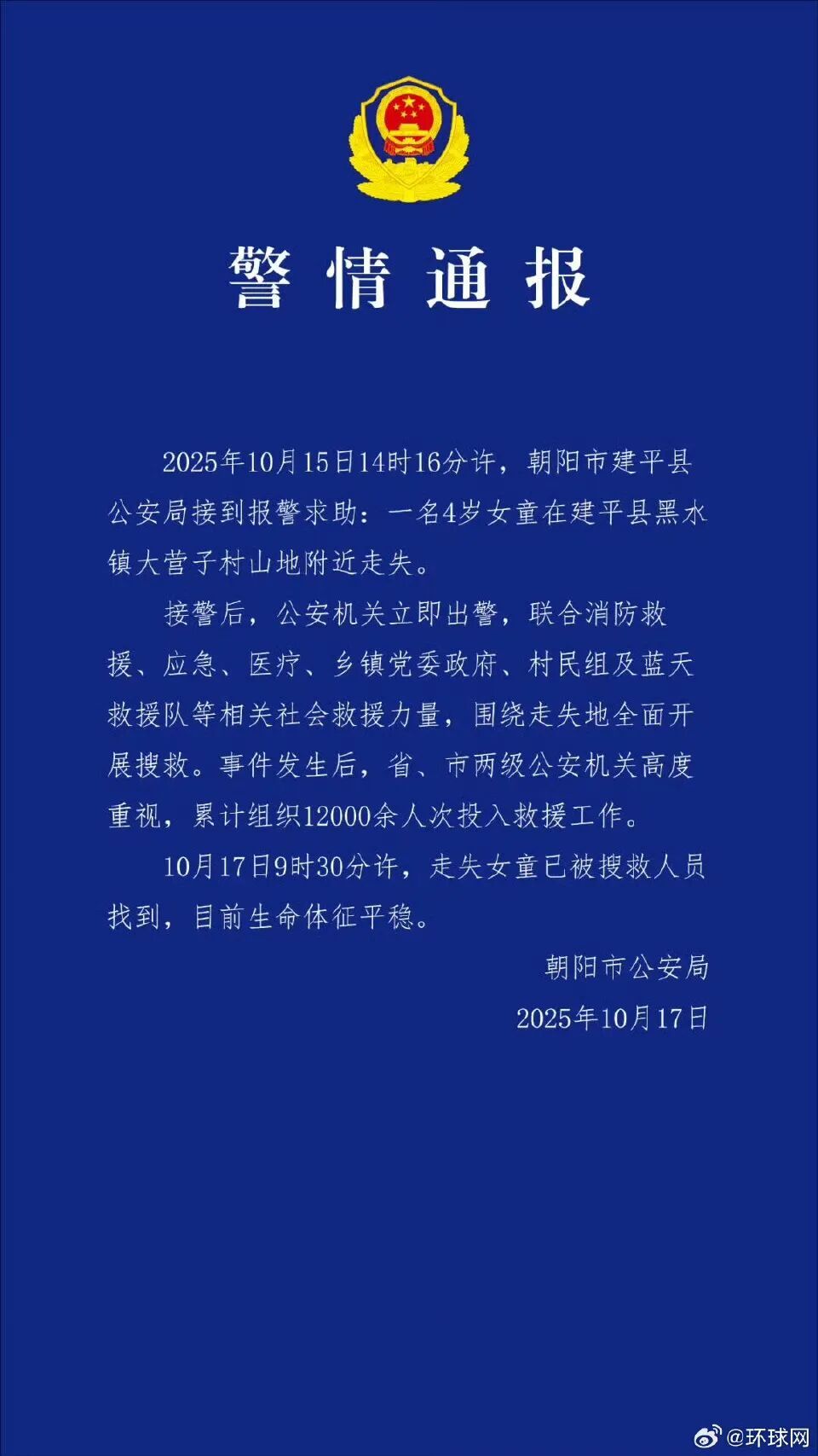 10月15日,辽宁省朝阳市建平县黑水镇二芬地村4岁女孩丁怡失踪,令不少人震惊。上午 9 点 40 分左右17日,记者吉农从救援人员处获悉,孩子已被找到,目前身体状况良好。此前报道:祖父母去田里收秋收,他们4岁的孙女睡在田边的卡车里。 20多分钟后,奶奶回到车上,发现孙女不见了。门仍然关着,窗户开着。当地近千名居民彻夜搜寻,但一无所获。据10月16日上午失踪女孩家属介绍,女孩于15日下午1时30分左右失踪,来自辽宁省朝阳市建平县黑水镇二芬地村。他们已经呆了快24小时了。家人愿意悬赏十万余如果好心人能找到并归还孩子。一份失踪人员通知书(受访者提供)显示,失踪女孩名叫丁怡。她4岁了。他穿着一件红色夹克,皮肤黝黑。下午1时30分左右,他在建平县黑水镇二芬地村田间失踪。 10月15日,“警犬、无人机和红外摄像机搜查了山上和房屋,但我们没有找到任何人。”丁一的表弟告诉吉姆新闻,丁一的父母在南方工作,平时都是爷爷奶奶照顾她。下午 1:00 左右15日,丁一跟着爷爷奶奶开着皮卡去田里收秋收。然后,爷爷奶奶去地里干活,丁乙就睡在卡车上。 20多分钟后,奶奶回到面包车上,发现丁一不见了。货车门锁着,窗户开着。孩子有可能起身,走出窗外,迷路或被带走。 “现在,男孩的父亲已经赶回来,并在房子附近提交了一份失踪报告。这个男孩很害羞,说话声音很低。 “如果好心人找到了男孩并归还,我们愿意给他10万元的奖励。”丁一的表弟说。当地黑水派出所的官员告诉吉姆新闻记者,昨晚警方彻夜搜寻,除了警察之外,包括志愿者和救援队在内的近千人正在搜寻。当地天气条件不太好,气温较低,孩子们还太小。 不排除他们有生命危险的可能性。我们希望尽快找到孩子。综合黄金云和之前的报告。